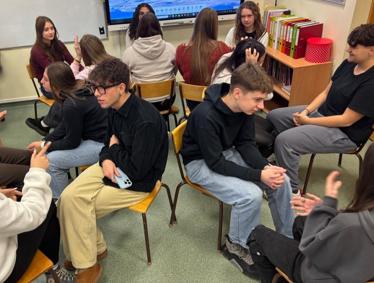 2025 m. lapkričio 17 – 21 dienomis mūsų gimnazijoje lankėsi grupė moksleivių ir mokytojų iš I.T.S. Salvatore Citelli mokyklos Regalbuto mieste, Sicilijoje (Italija). Susitikimo metu buvo tęsiamos Erasmus + projekto „Mažiau yra daugiau“ („Less is More“) veiklos, siejamos su tvarumu, ekologija ir vartotojiškumo mažinimu. Po trumpų smagių veiklų pirmąją dieną buvo atliktos užduotys, kur mokiniai dėliodami kortelių sekas, analizavo klimato kaitos rizikas, pagrindines priežastis ir numatė pasekmes. Naudodami floodmap įrankį mokiniai stebėjo jų gyvenamos vietos užtvindymo riziką pakilus jūros lygiui, ir duomenis pateikė ArcGIS Survey123 formoje. Visas penkias susitikimo dienas buvo ieškota pavyzdžių, kaip taikomi klimato kaitos mažinimo principai realioje aplinkoje. Ypač daug jų buvo užfiksuota lankantis Vilniuje, Žaliojoje Europos sostinėje. Visa projekto dalyvių surinkta medžiaga buvo pateikta jų kurtuose skaitmeniniuose plakatuose ir infografikuose. Besibaigiant veiklų savaitei, visa surinkta ir apibendrinta informacija buvo pateikta skaitmeninėje knygoje, sudarytoje Book Creator programėlės pagalba.
