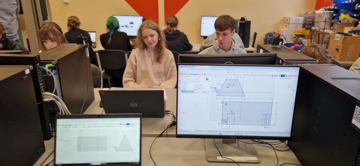 Lapkričio 26 d. šešiolika mūsų gimnazijos Academia mokinių lankėsi Šiaulių STEAM centro Robotikos ir informacinių technologijų laboratorijoje (TŪM veklos Nr. 53). Jie dalyvavo edukaciniame užsiėmime „Tapk produkto dizaineriu“, kurio metu susipažino su šiuolaikinės skaitmeninės gamybos galimybėmis. Mokiniai, naudodami kompiuterinės braižybos programą Onshape, projektavo savo sukurtus objektus. Vėliau jų sumanyti ir nubraižyti gaminiai buvo išpjauti lazerinėmis pjovimo–graviravimo staklėmis. Edukacija ne tik praplėtė technologinį akiratį, bet ir suteikė praktinės kūrybinės patirties.