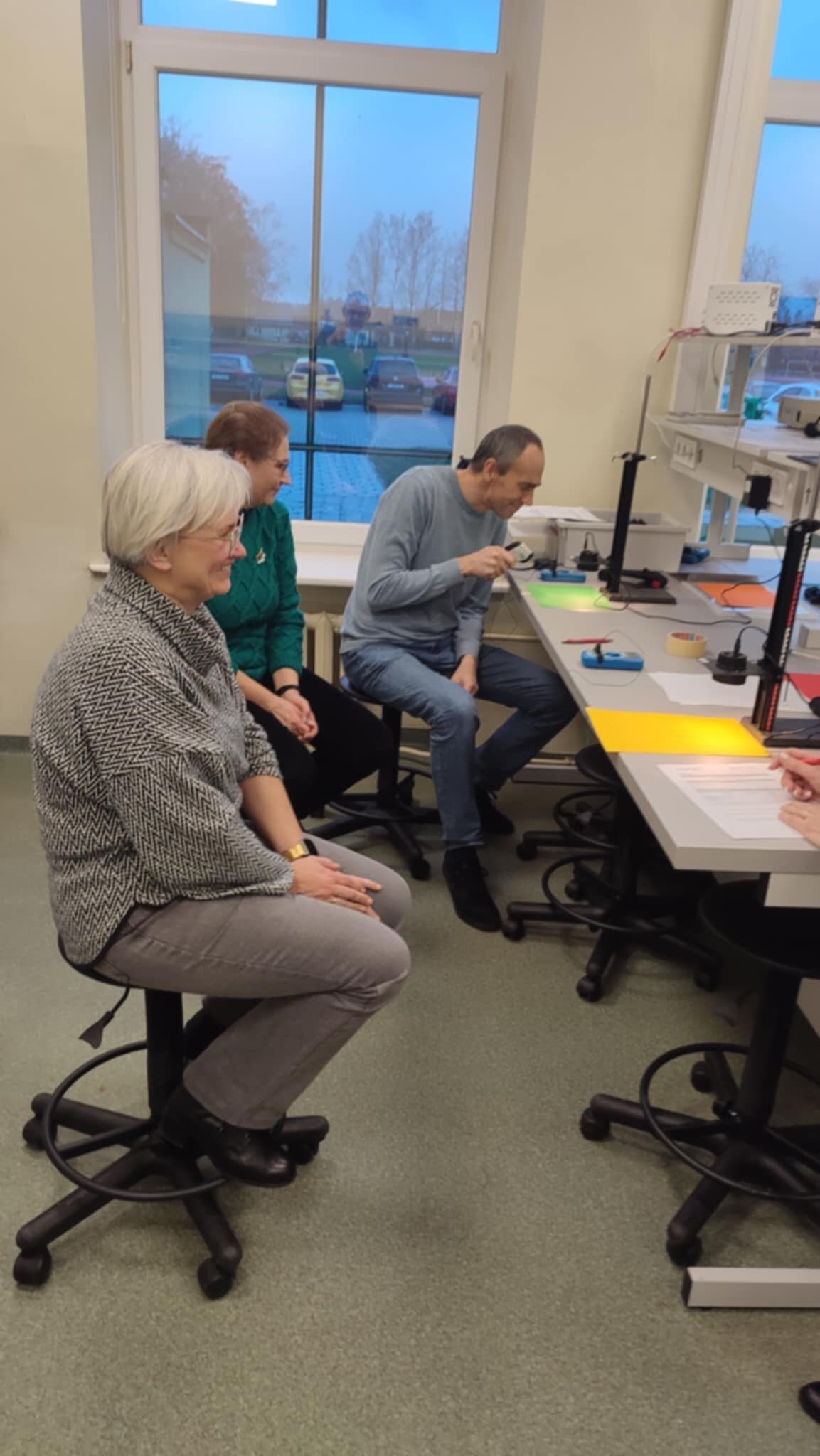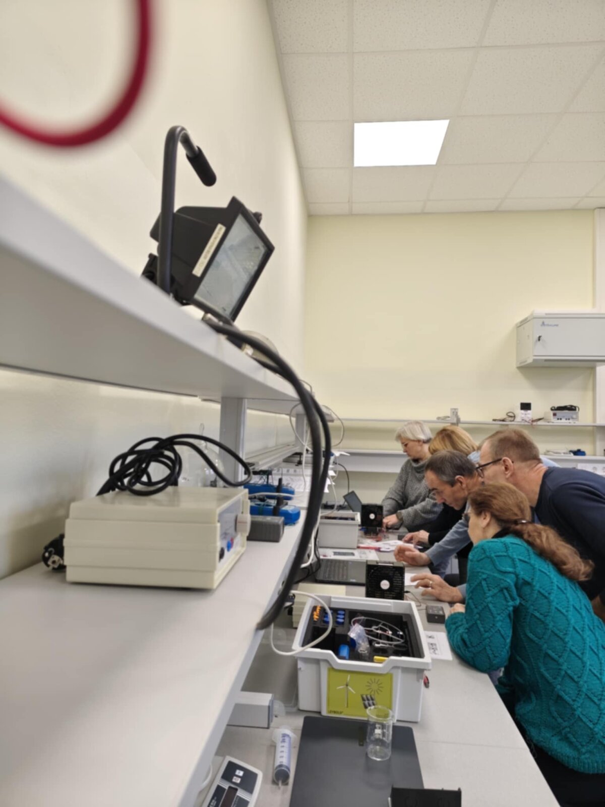 Fizikos laboratorijoje mokytojai gilinosi į magnetinio lauko tyrimus: matavo magnetinę indukciją, skaičiavo induktyvumą, analizavo atsinaujinančių energijos šaltinių veikimo principus. Dalyviai praktiškai susipažino su vėjo jėgainių, saulės elektrinių ir elektrolizerio veikimu, aptarė šių technologijų privalumus, trūkumus ir taikymo galimybes.