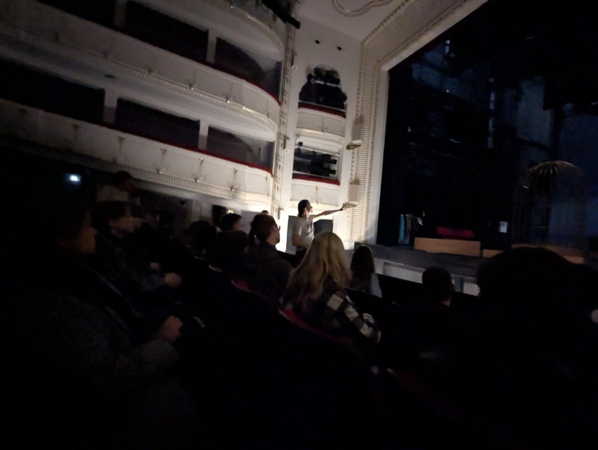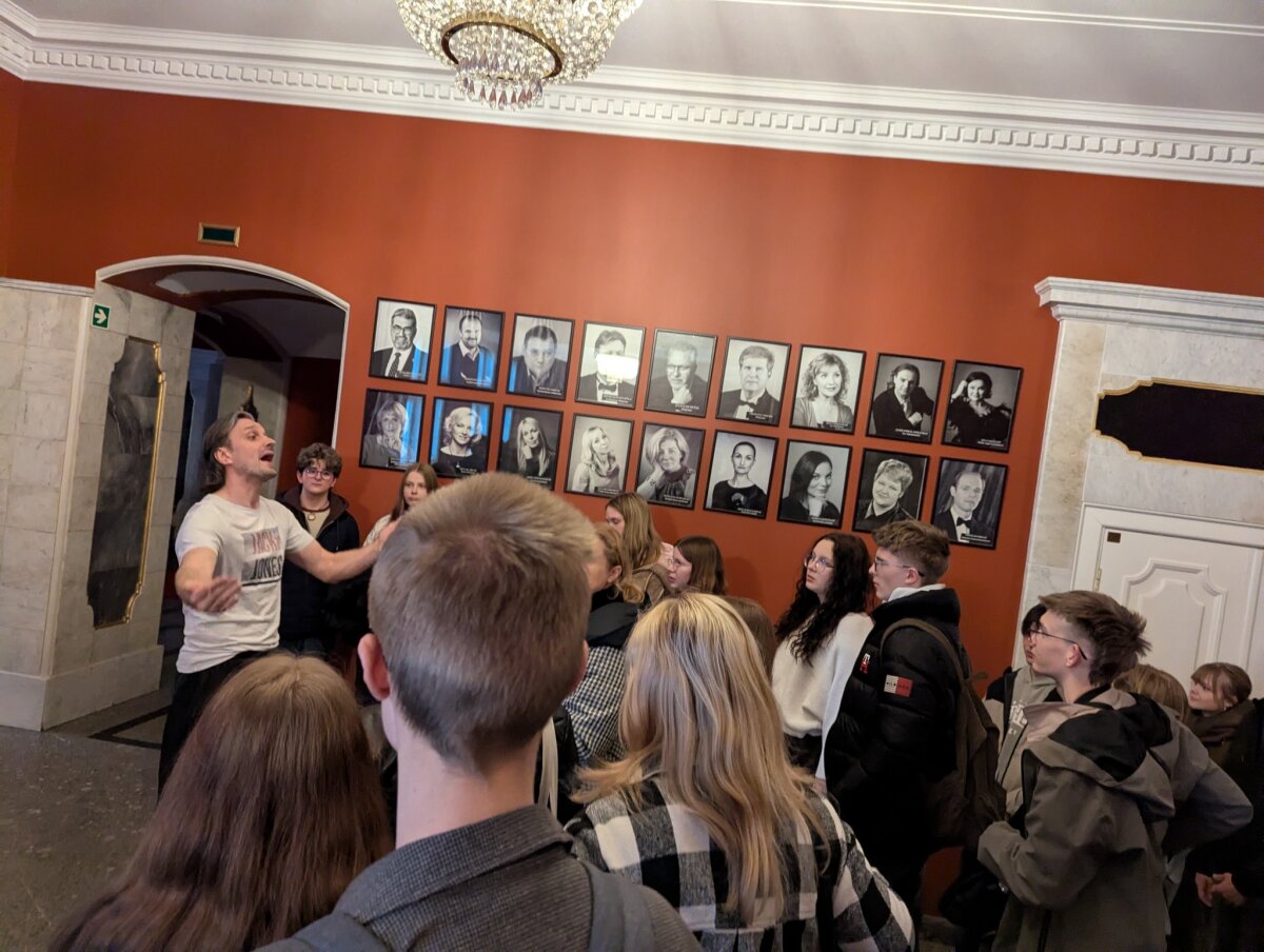 Išvyką vainikavo edukacija Kauno valstybiniame muzikiniame teatre, kurią vedė Gintaras Visockis. Jos metu mokiniai susipažino su teatro užkulisiais, scenos meno subtilybėmis bei aktoriaus profesijos ypatumais.